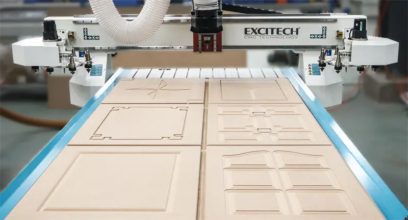 EXCITECH wood nesting machine structure of the machine is exquisite, achieving a win-win of speed and precision. Standard double spindle in the machine, can be used for cutting and engraving, and it can also clamp different tools for different function. With the push device, the wood panel can be unloading from the processing table automatically, convenient for the operator to take the panel. At the same time, double working station processing without interruption, can save time for completion and greatly improve production efficiency saving processing time and improving processing efficiency greatly. Meanwhile, the machine also can be equipped with auto feeding platform.The machine is equipped with vertical boring unit for vertical punching in the panel. It can be docked with EXCITECH cabinet software, optimized materials, can be flexible and cost-effective.